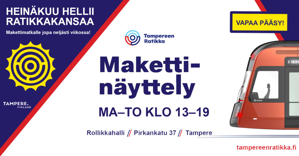 Tampereen Ratikan Maketti-näyttely on heinäkuussa avoinna maanantaista torstaihin klo 13-19. Näyttelyllä on laajennetut aukioloajat koko heinäkuun. Ryhmät ovat tervetulleita heinäkuussa ilman ennakkovarausta näyttelyn aukioloaikoina.
