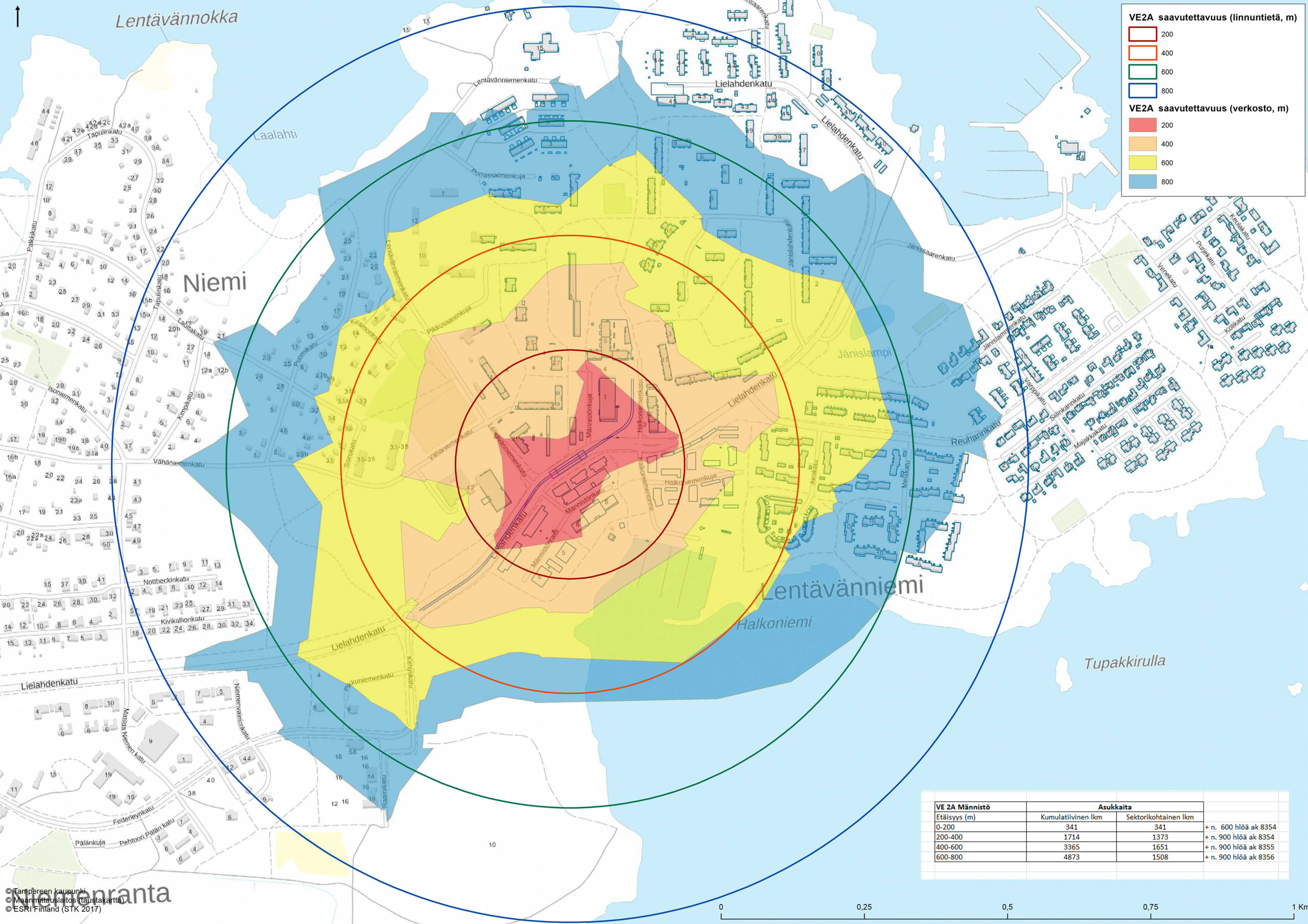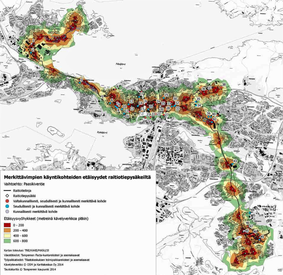 Kuva 3.2. Kuvia saavutettavuustarkasteluista Tampereen raitiotien yleissuunnitelman ja Lentävänniemen päätepysäkin vaihtoehtovertailun yhteydessä.