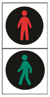 Kuva 3.6. e) Tavallinen jalankulkijaopastin. Käytetään ajoradan, pyörätien tai raitiotien ylityksen täydellisessä liikennevalo-ohjauksessa.