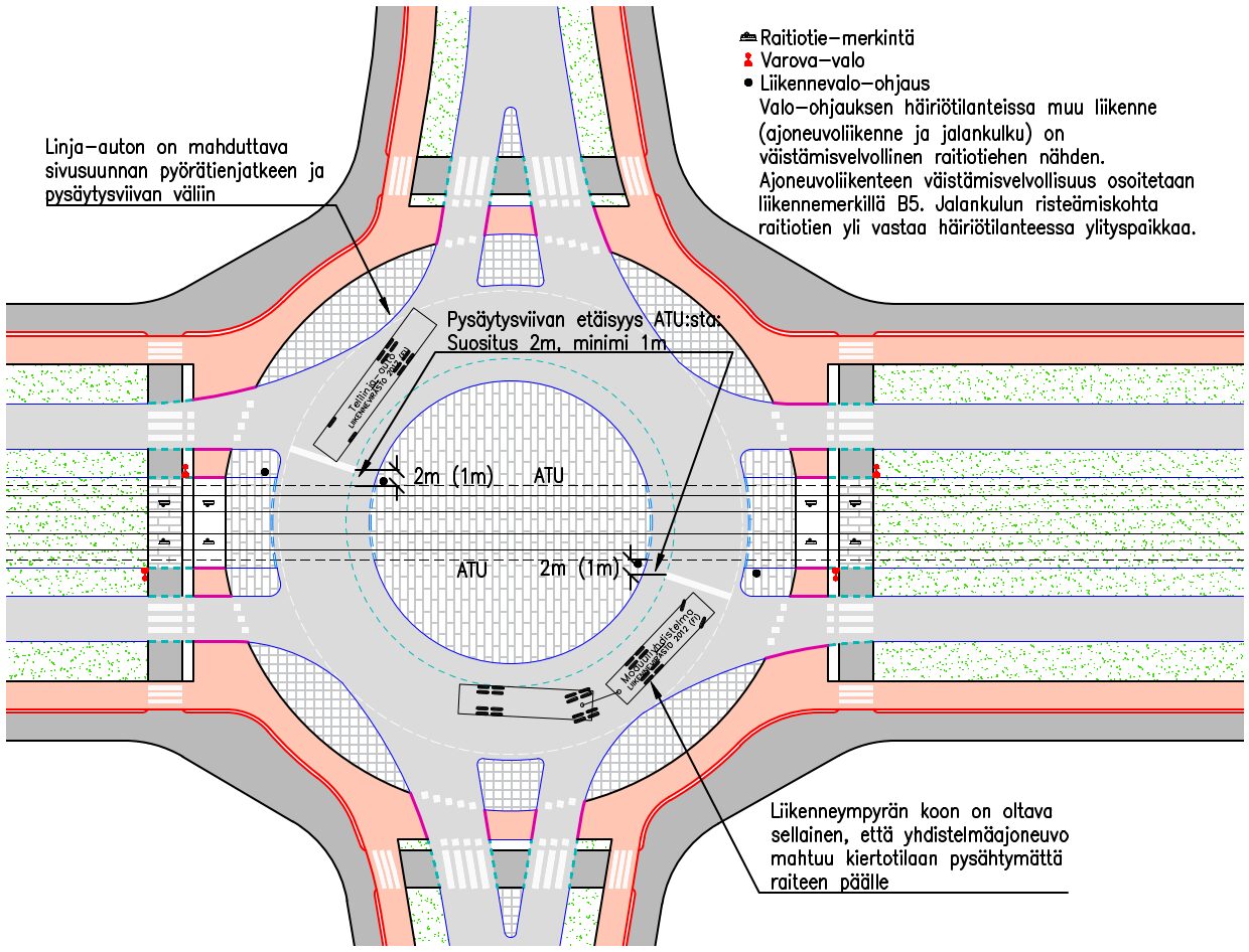 Liikenneympyröissä raitiovaunulle tulee järjestää esteetön kulku liikenneympyrän läpi liikennevalo-ohjauksen avulla.