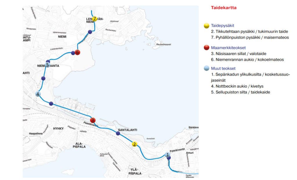 Ratikan taiteen toisen osan yleissuunnitelmassa on määritelty paikat, johon taidetta tullaan toteuttamaan. Reitin varrelle tulee viisi maisemateosta ja integroituvaa taidetta sekä taidetta kahdelle pysäkille. Taidetta suunnitellaan yhtaikaisesti muun suunnittelun kanssa ja tavoitteena on, että taide myös toteutuu infran rakenteiden kanssa samaan aikaan.