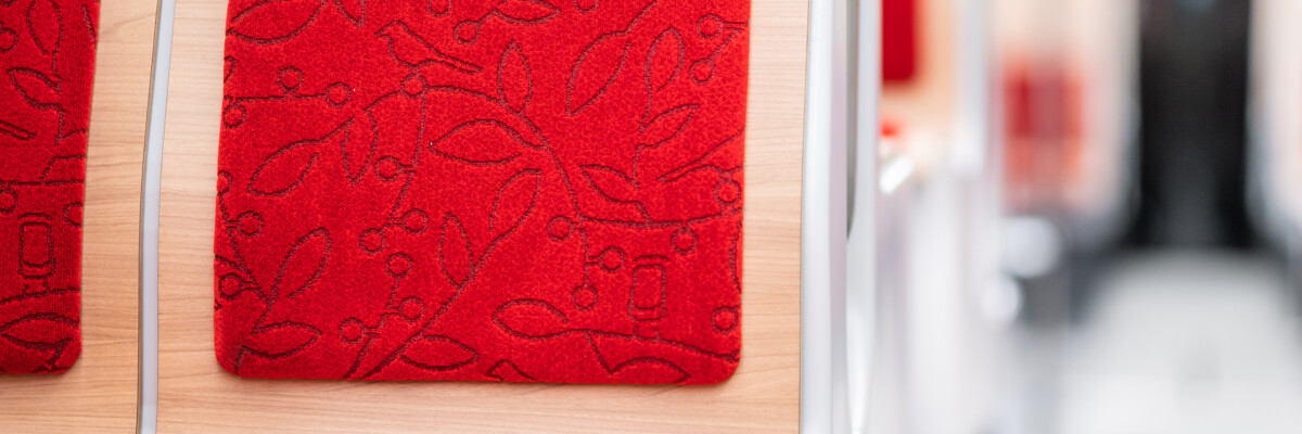 Ensimmäisessä ratikassa Pirkanmaa kuosissa, sanataidetta ikkunassa