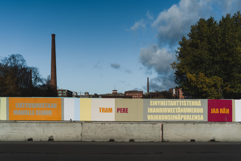 Hämeensillan työmaata reunustavan vaneriaidan maalaus tekee kunniaa Ratikan edustamalle uudelle Tampereelle ja vanhalle Tampereen murteelle. Tarmo Paunun teos Trampere avaa katsojalleen Ratikalla matkustamista, peilaten sitä paikalliseen kieleen.
