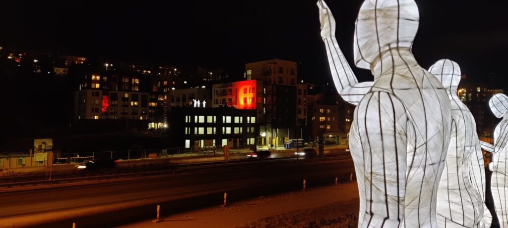 Valoa hehkuvat valohahmot ilahduttavat nyt talven ajan raitiotietyömaan aluetta Santalahdessa. Paasikiventien ja Paasikivenkadun eritasoliittymän maisemiin, osan 2A alueelle, on sijoiteltu kymmenen valohahmoa. Tarkempina sijoituspaikkoina ovat työmaakoppien ja asuinrakennuksen katot sekä Santalahdenpuiston puoleinen meluvalli.