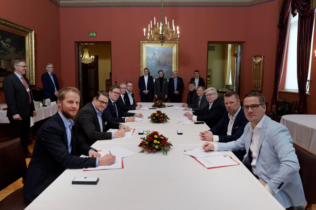 Tampereen Ratikan Pirkkala-Linnainmaa -allianssisopimuksen allekirjoitustilaisuus Raatihuoneella 4.10.2023. Pöydän ympärillä Milko Tietäväinen, Jouko Aarnio, Juho Siipo, Pekka Sirviö, Marko Jarva, Harri Luukkarinen, Jouni Kekäle, Ville-Mikael Tuominen, Jaakko Joensuu, Juha Yli-Rajala, Mikko Inkala, Mikko Nurminen, Risto Räty, Kalervo Kummola, Antti Korhonen, Aleksi Laine. Kuva: Wille Nyyssönen/Tampereen Raitiotie Oy