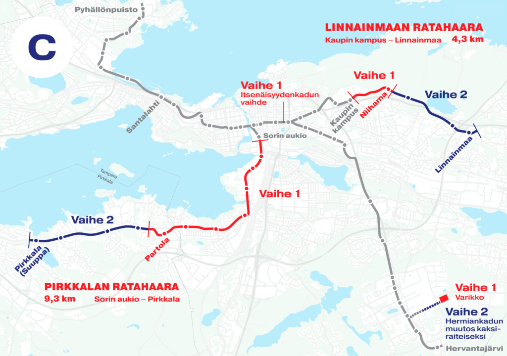 - Pysäkit: Rakennetaan 7 pysäkkiparia lisää, lopulliset päätepysäkit rakennetaan Pirkkalan Suuppaan ja Tampereen Linnainmaalle.