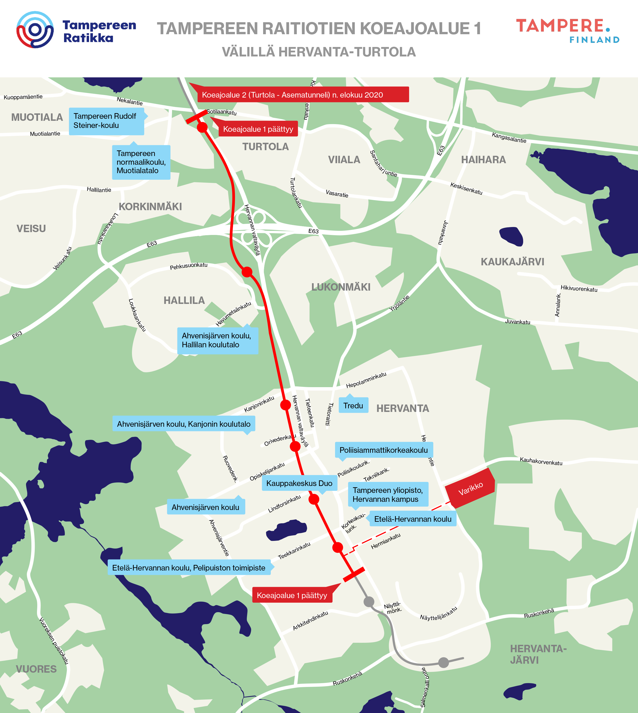 Hervannassa sijaitsevan raitiovaunuvarikon ja Turtolan raitiopysäkin välisellä rataosuudella tehdään testejä kaikkien raitiotien teknisten järjestelmien osalta. Jokaisella testiosuudella vaunua liikutetaan ensin kävelyvauhtia eli enintään viiden kilometrin tuntinopeudella. Nopeustestit tehdään kadun tai radan maksiminopeuksien mukaisesti, joka Hermiankadulla on 50 km/h, Atomipolulla 15 km/h, Insinöörinkadulla 30 km/h ja Hervannan valtaväylällä 70 km/h. Testien aikana käytetään liikenteenohjaajia, jotka tarvittaessa hetkellisesti pysäyttävät autoliikenteen ja ohjaavat jalankulkua ja pyöräilyä.