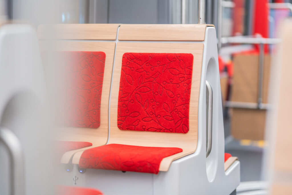 Ratikan penkkien raikkaan punainen kuosi on muotoilija Laura Gröndahlin suunnittelema.